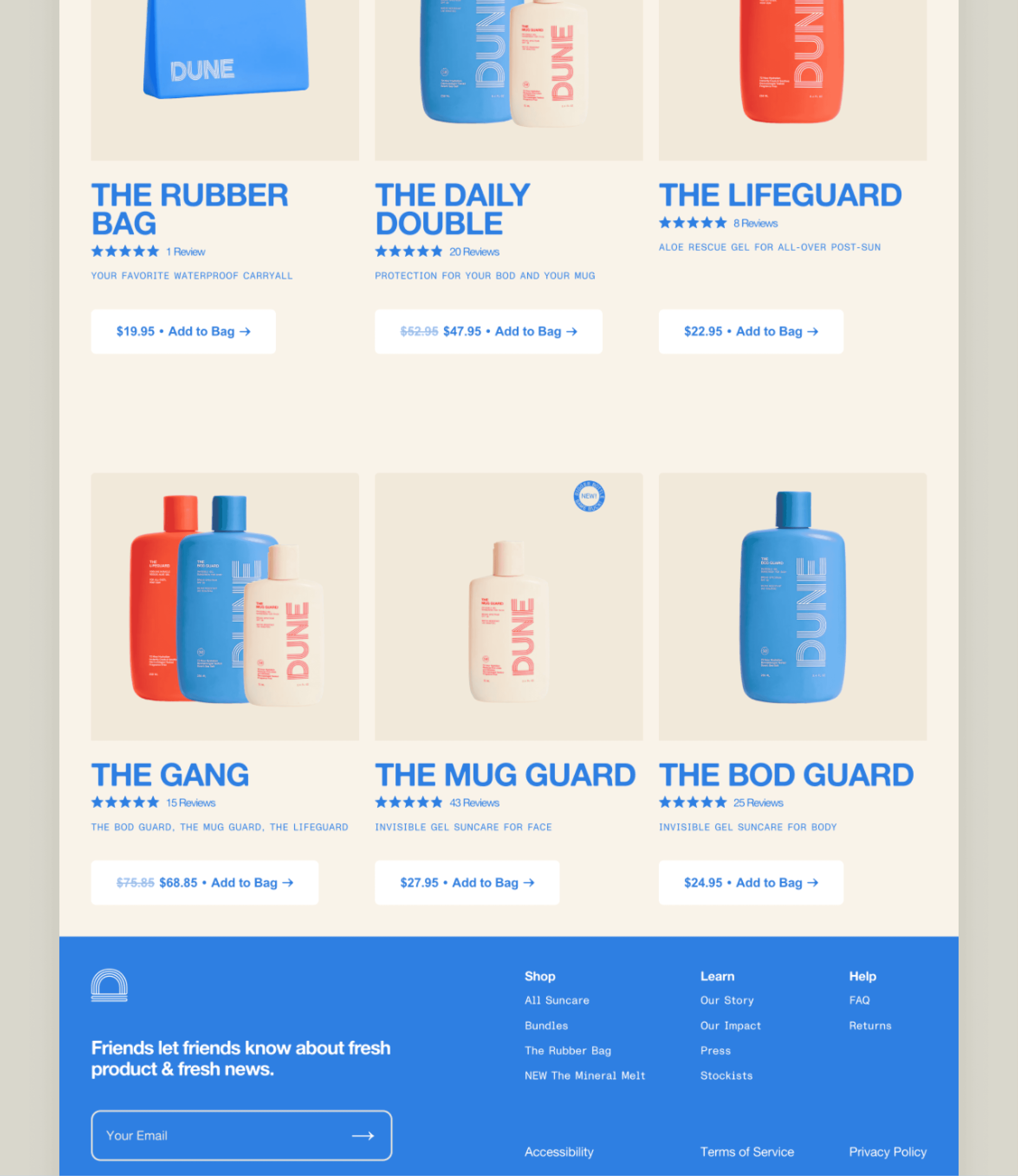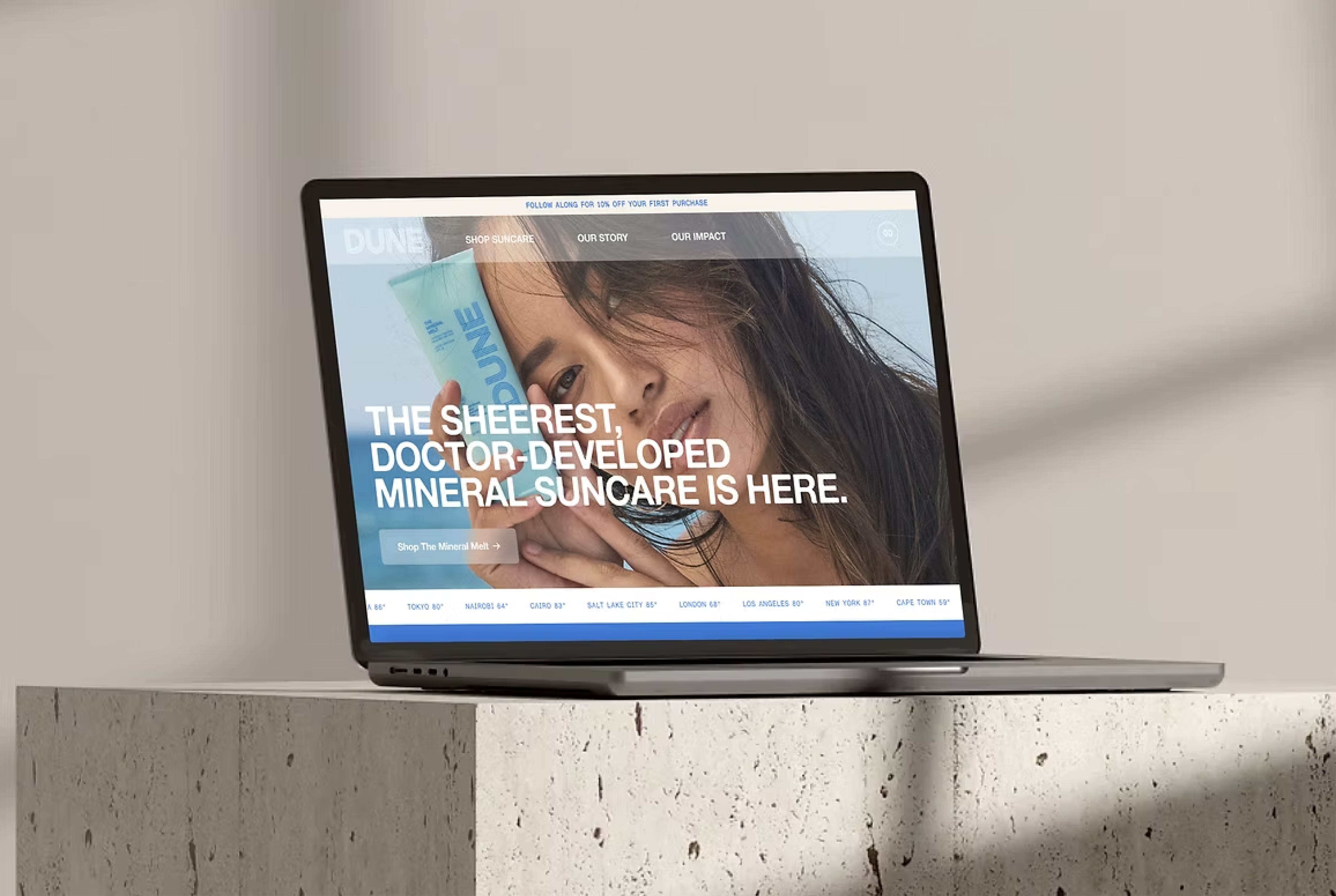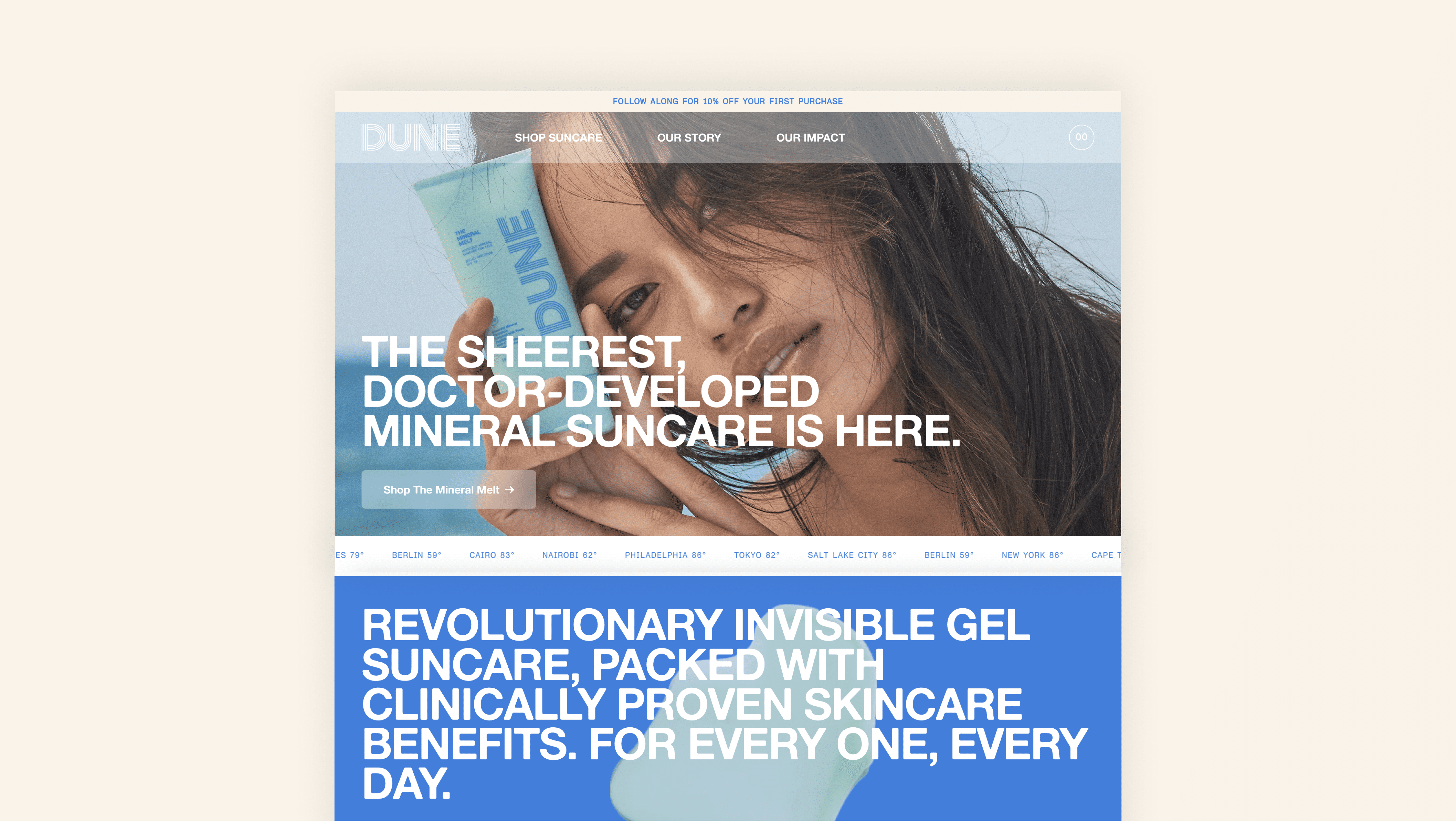 Dune Suncare is a pioneering brand dedicated to redefining sun protection with innovative, inclusive and sustainable solutions. I assisted with the design of their new website, achieved through carefully curated imagery and impactful iconography.
